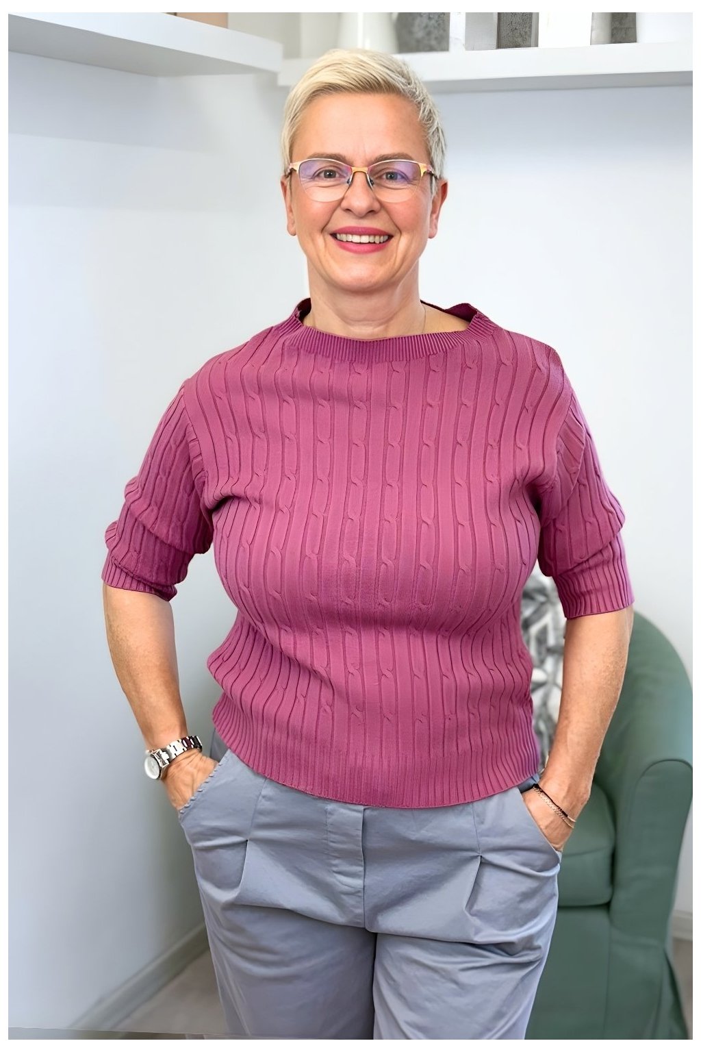 dámský svetřík se vzorem, úpletový svetřík, elegantní dámský svetr, svetřík s rukávem ke lokti, pohodlný svetr pro ženy, svetřík do práce, dámský svetr na celý rok.