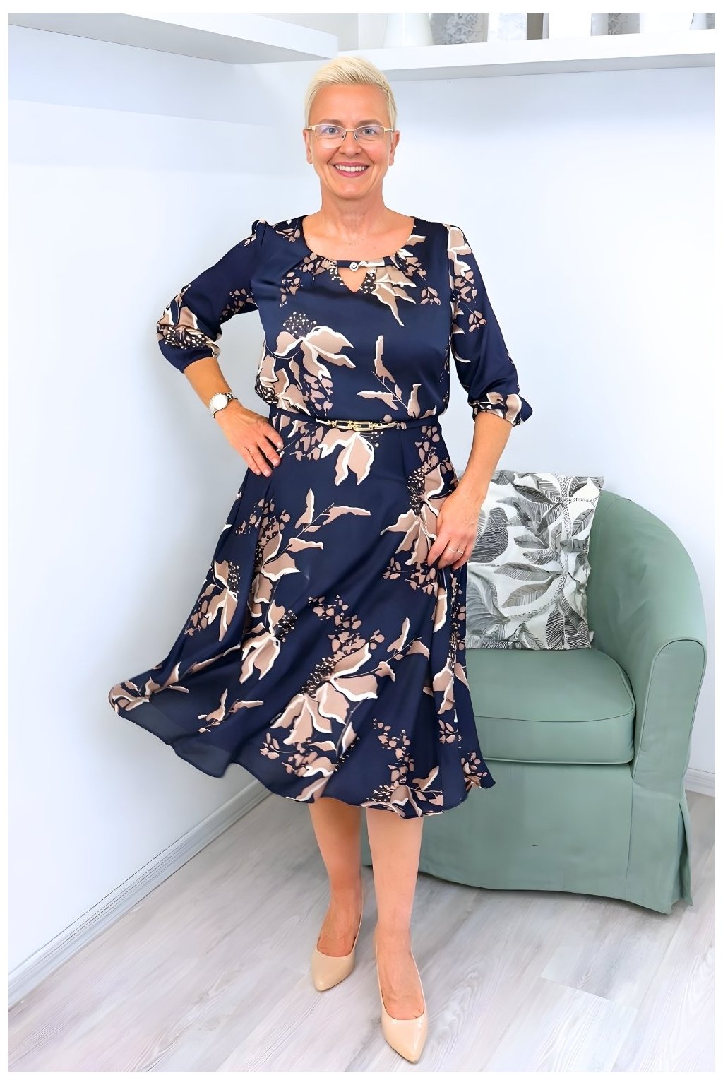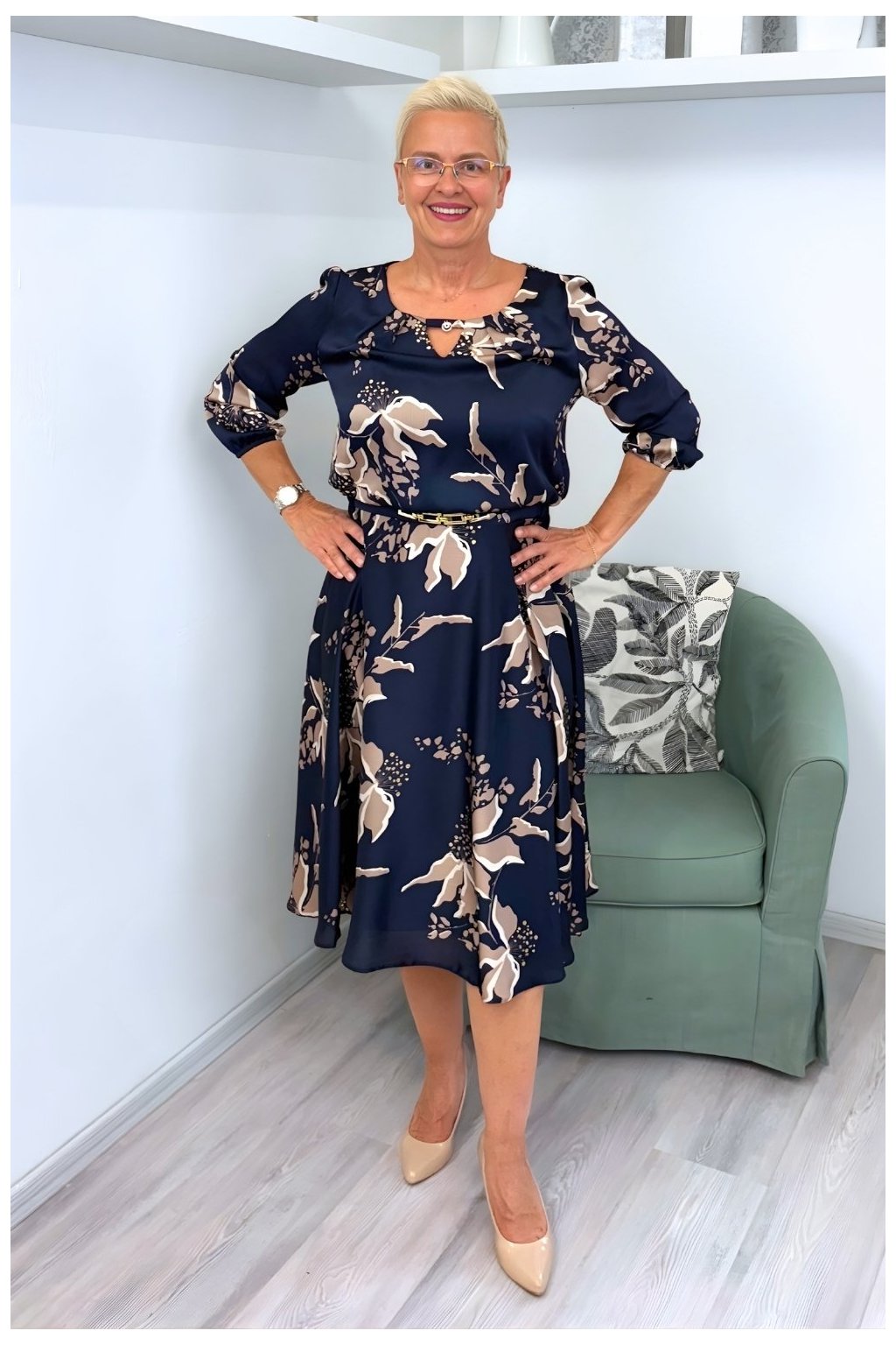 společenské šaty, tmavě modré šaty, šaty s květy, šaty na svatbu, šaty do divadla, šaty do kanceláře, šaty s tříčtvrtečním rukávem, šaty do A, elegantní dámské šaty, slavnostní šaty.