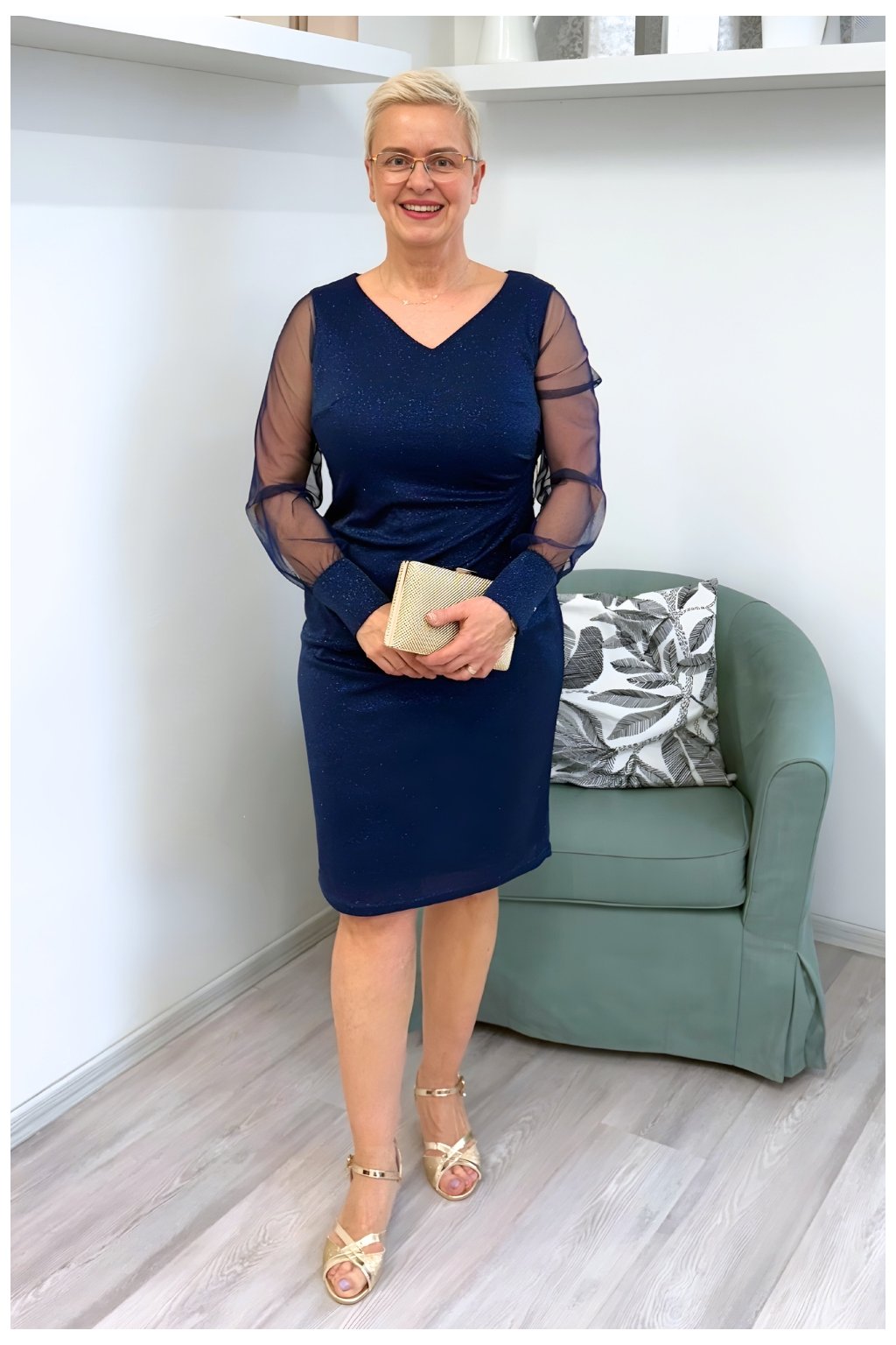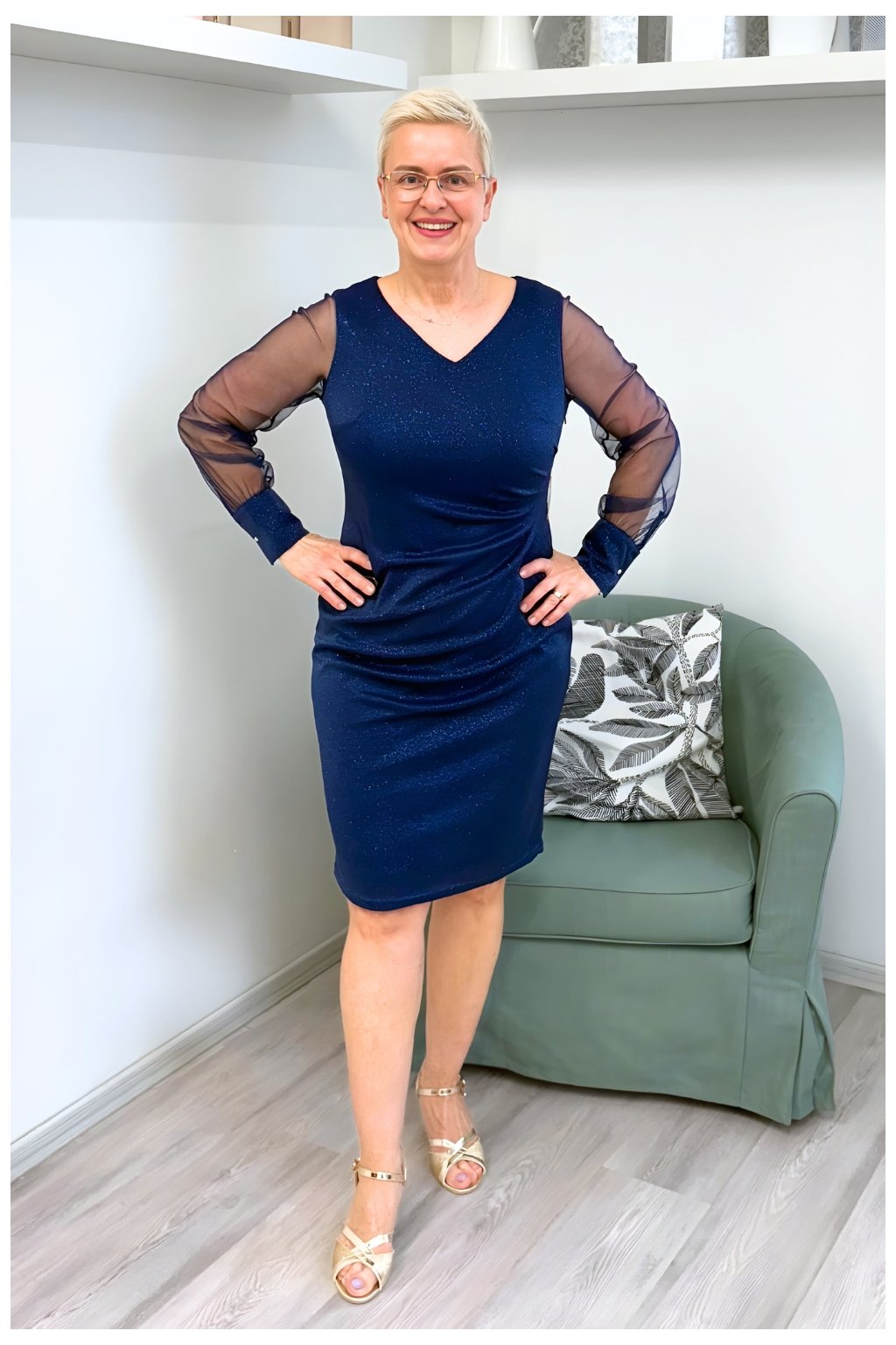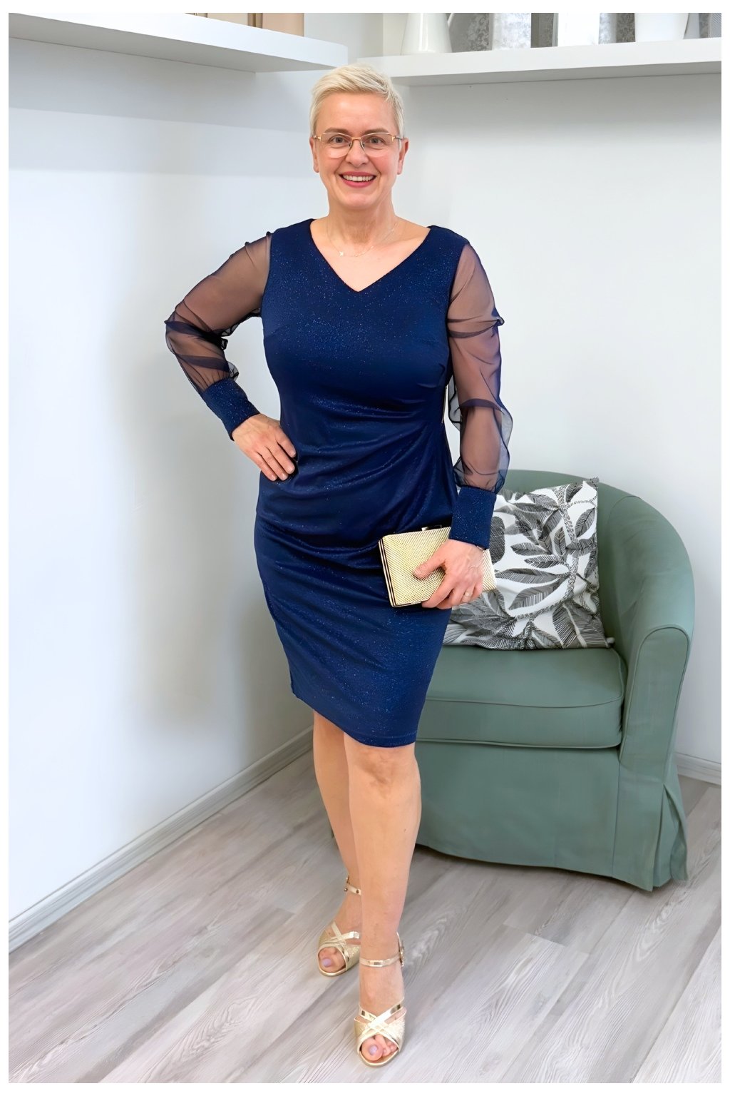 tmavě modré třpytivé šaty, společenské šaty s průhlednými rukávy, koktejlové šaty pro plnoštíhlé, šaty se zlatou sponou, elegantní šaty do divadla, třpytivé pouzdrové šaty, večerní šaty Blanka Straka