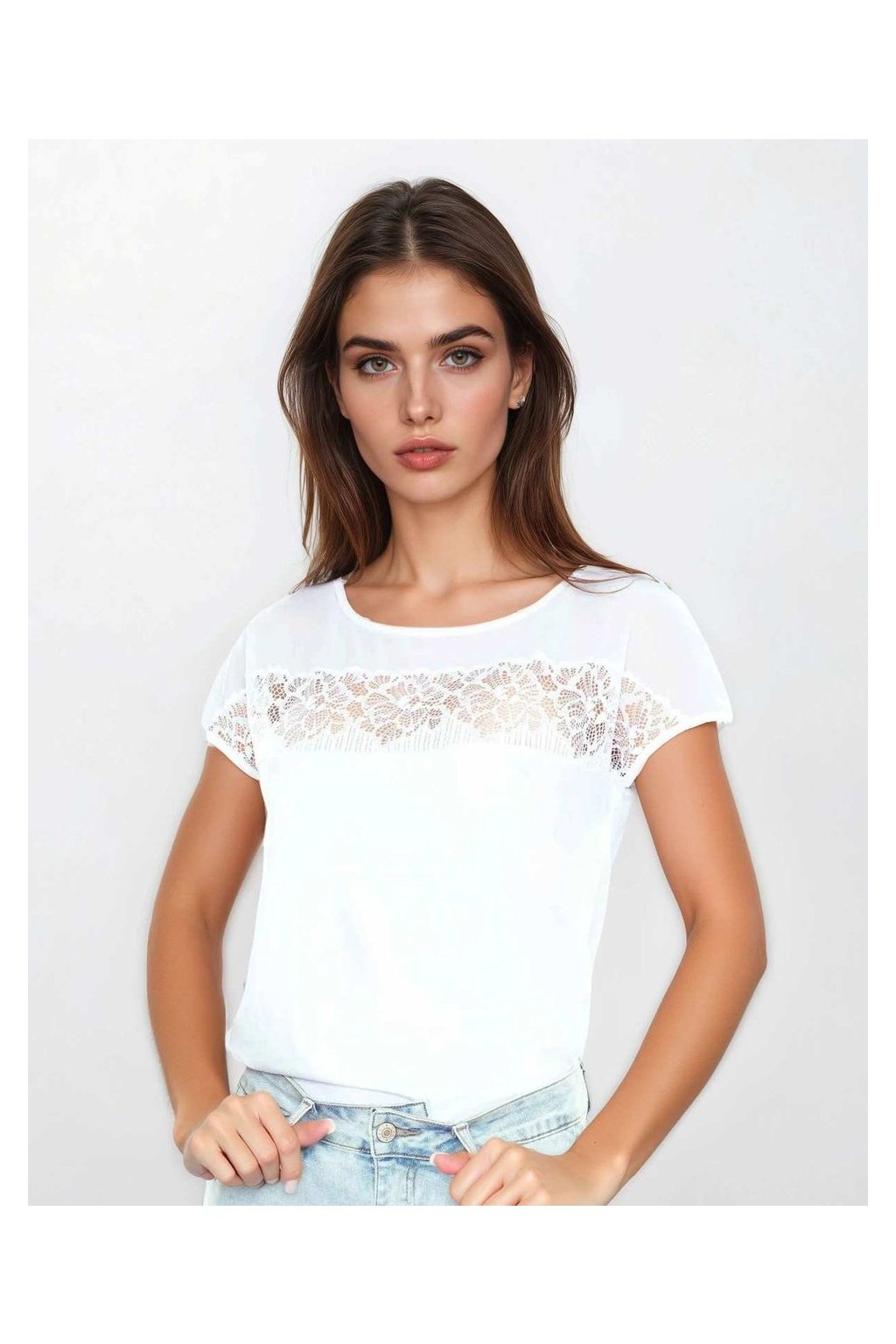 Elegantní halenka s krátkým rukávem, která kombinuje čistý, minimalistický základ s jemným krajkovým pruhem v oblasti hrudi a zad. Krajkový detail působí lehce a žensky, aniž by byl okázalý, a dodává halence kultivovaný, svěží výraz. Hladký viskózový materiál je příjemný na dotek, krásně splývá a zajišťuje komfort po celý den. Model působí upraveně, lehce a je ideální volbou pro ženy, které hledají jednoduchý kousek s decentním detailem.