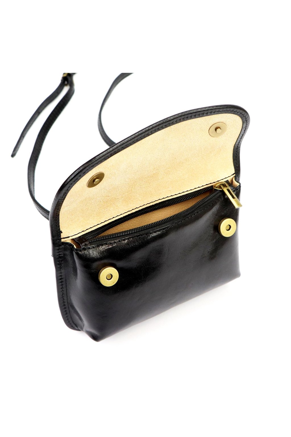 Menší dámská kabelka obdélníkového tvaru s klopou a magnetickým zapínáním. Tělo kabelky je měkčí, lehce poddajné, díky čemuž působí přirozeně a elegantně. Pod klopou se nachází hlavní prostor uzavíratelný na zip pro bezpečné uložení osobních věcí. Vnitřní část je podšitá a nabízí dostatek místa na telefon, peněženku i drobnosti. Úzký, délkově nastavitelný kožený popruh umožňuje nošení přes rameno nebo crossbody. Přední stranu zdobí reliéfní logo Vera Pelle – Made in Italy.
