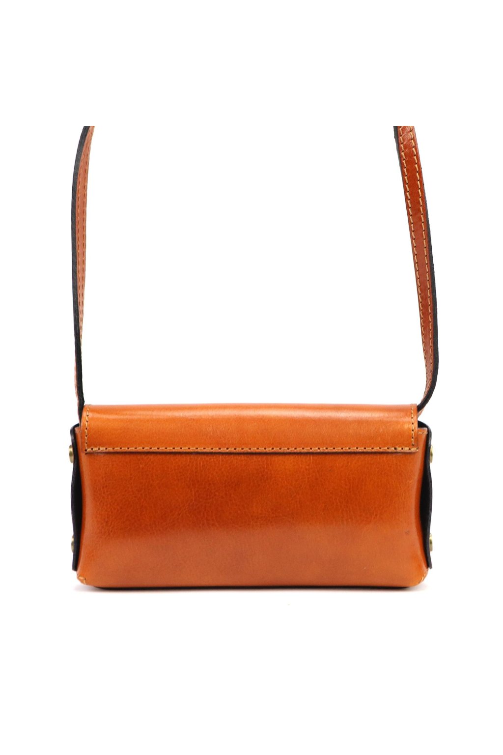 Malá dámská kabelka kompaktního obdélníkového tvaru s klopou a zapínáním na magnetický druk. Konstrukce je pevná, boky jsou zpevněné kovovými nýty, které podtrhují odolnost a stabilitu tvaru. Pod klopou se nachází jeden hlavní prostor bez vnitřního členění, ideální pro základní nezbytnosti. Kabelka je vybavena úzkým, délkově nastavitelným koženým popruhem pro nošení přes rameno nebo crossbody. Přední stranu zdobí reliéfní logo Vera Pelle – Made in Italy.
