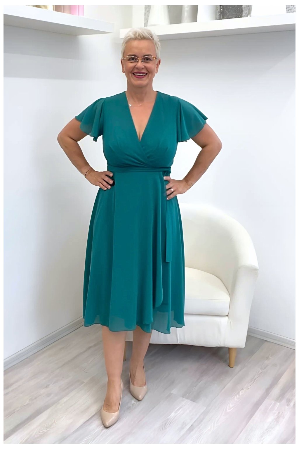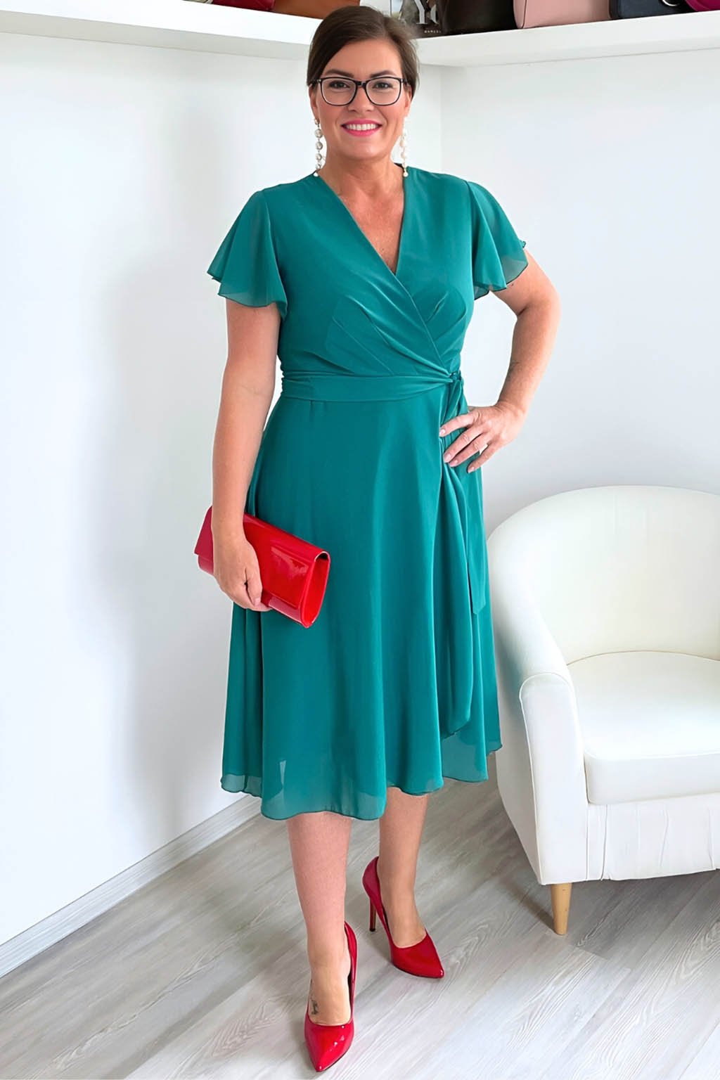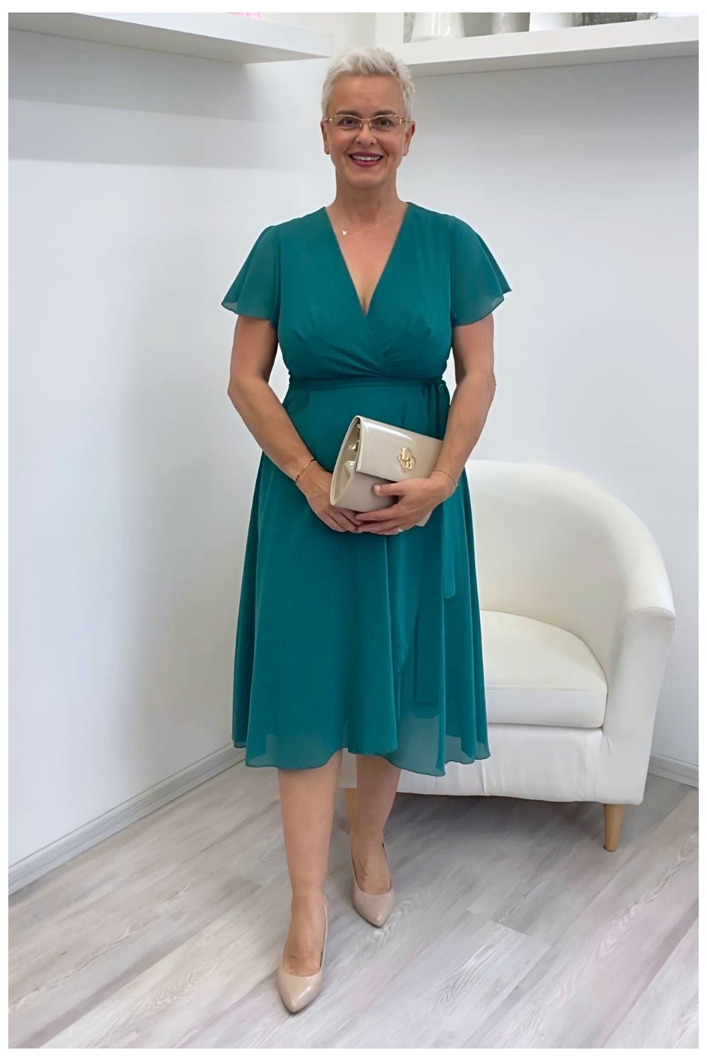 Zelené zavinovací šaty, Elegantní šaty na svatbu, Společenské šaty s krátkým rukávem, Letní šaty na oslavu, Zavinovací šaty pro plnoštíhlé